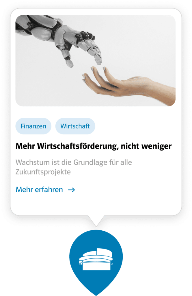 Machen Sie einen Spaziergang durch die Stadt und erleben Sie unser 3D Wahlprogramm! Bewegen Sie die Maus über die Markierungen auf der Karte, um mehr über unsere Schwerpunktthemen in den verschiedenen Stadtgebieten zu erfahren.